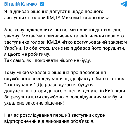"Я підписав рішення депутатів щодо першого заступника голови КМДА Миколи Поворозника. Мною ухвалене рішення про проведення службового розслідування щодо факту нібито якогось "святкування", – повідомив він.
