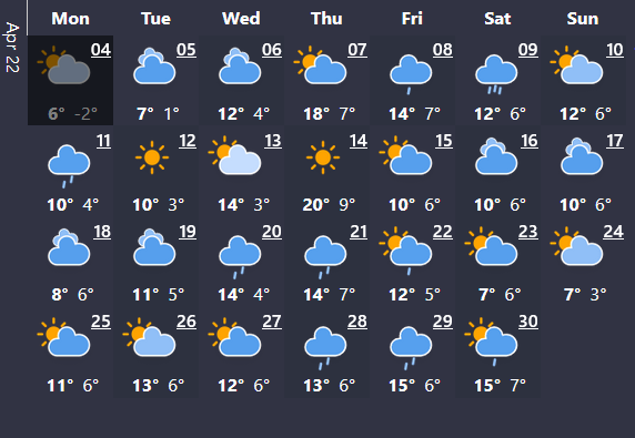 У квітні буде доволі прохолодно - вдень 6-14 градусів вище нуля, в нічний час - 1-4 °C тепла. Лише кілька днів будуть по-весняному теплі 7 та 14 квітня - очікується до 18-20 градусів удень. Під кінець цього тижня та на початку наступного - очікуються дощі. З 25 по 30 квітня прогнозують незначне зниження температури - до 6-11 градусів тепла.