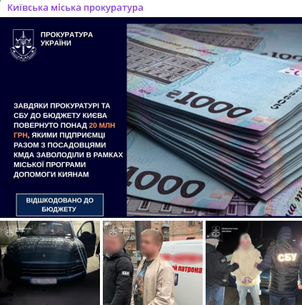 Зазначається, що двоє підприємців, підозрюваних у заволодінні бюджетними грошима, виділеними на допомогу киянам в рамках міської програми, повернули 12,5 млн грн та передали на потреби ЗСУ шість авто на суму 8 млн грн. Гроші виділялися для надання соцпослуг киянам, які не можуть про себе подбати.