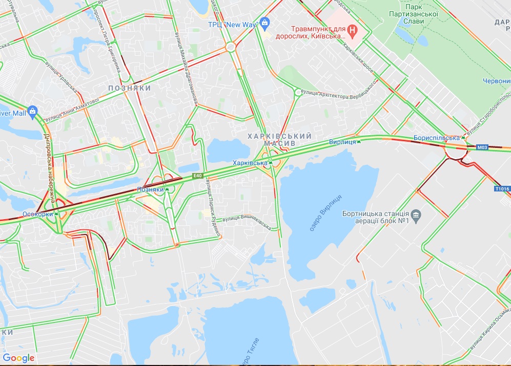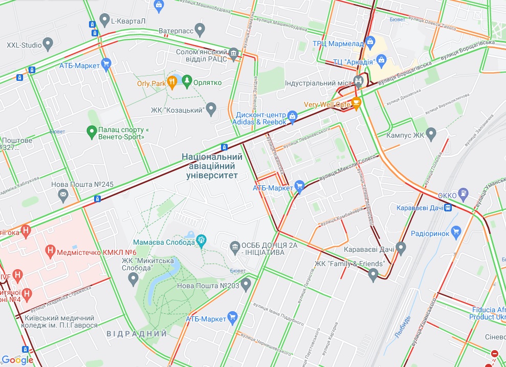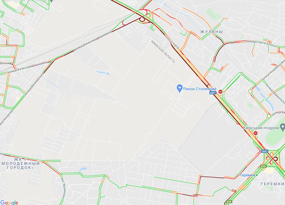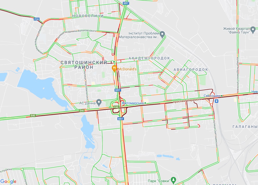 Від станції метро "Іподром" по Кільцевій дорозі стоїть рух, як і по вулиці В'ячеслава Чорновола неподалік. Пробки утворилися на вул. Соборна (Софіївська Борщагівка), вул. Леся Курбаса (Відрадний). Велика "тягучка" на вул. Борщагівській і в районі Індустріального моста. Затори спостерігаються біля метро "Берестейська", "Святошин" і "Житомирська".