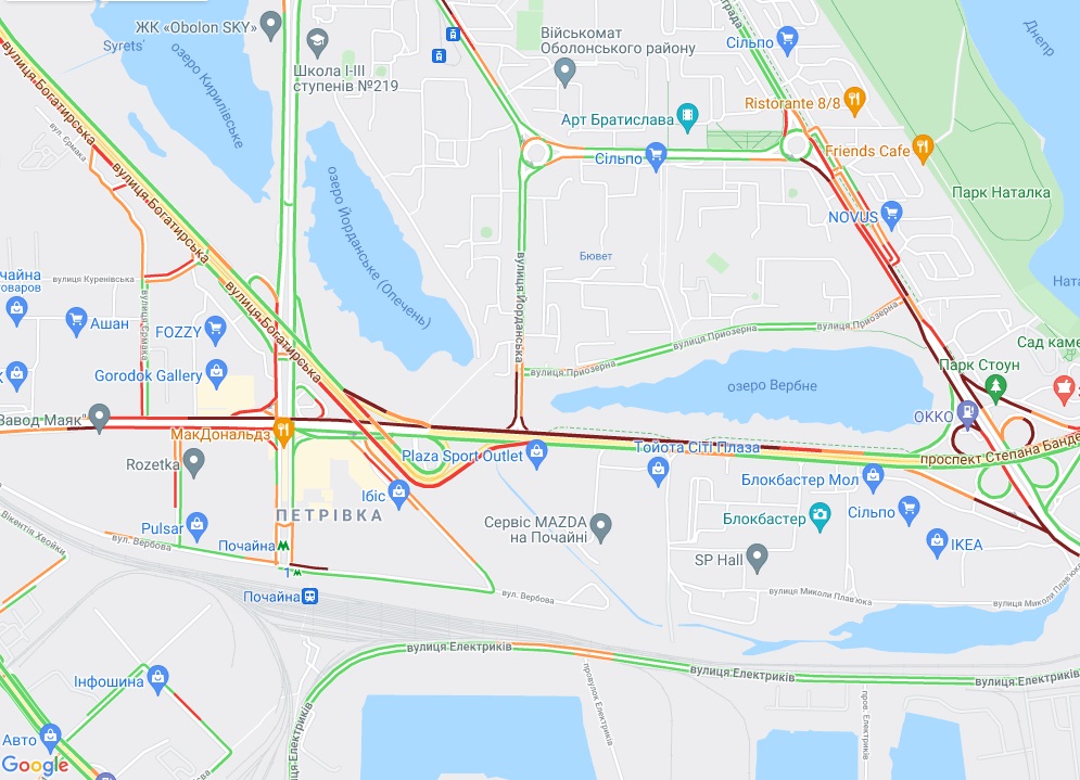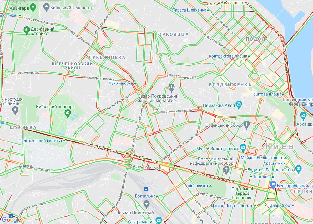 Водії стоять у заторі на проспекті Перемоги. Ускладнено рух транспорту на вул. Велика Васильківська, а також біля станцій метро "Палац спорту" і "Лук'янівська". Невеликі пробки утворилися на Наддніпрянське та бульварі Дружби народів. "Варто" вулиця Михайла Бойчука.