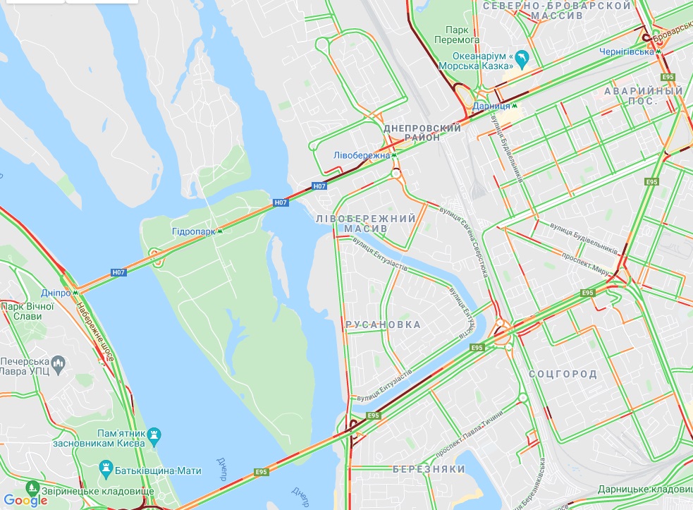 Ускладнено рух авто на вул. Оноре де Бальзака, вул. Володимира Маяковського, проспекті Романа Шухевича. "Тягучка" утворилася на проспекті Броварському, на вул. Братиславська, а також біля станцій метро "Дарниця" та "Лівобережна". Важко проїхати по Дарницькому шосе в районі Русанівки, біля станцій метро "Позняки", "Осокорки" та "Бориспільська".