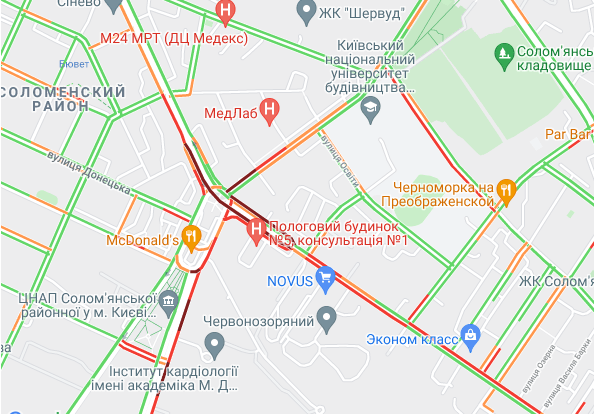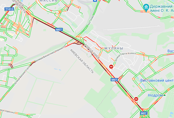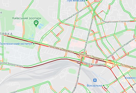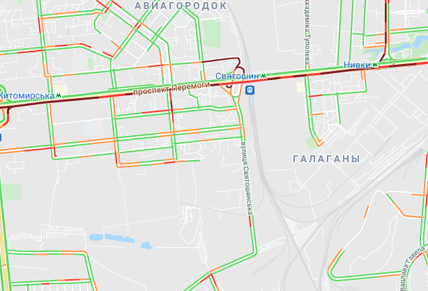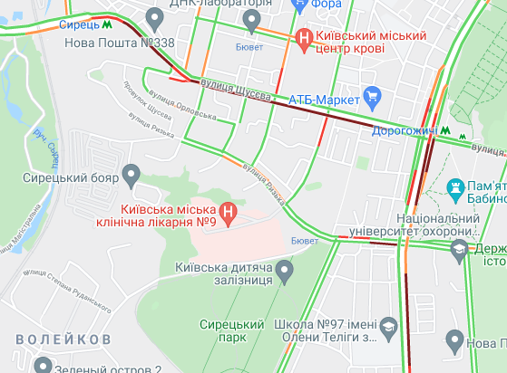 Пробки утворилися по Кільцевій дорозі, на Голосіївському проспекті і на під'їздах до Севастопольської площі. Стоїть вулиця Вадима Гетьмана (від ТРЦ Мармелад до вул. Польова). Утворилися затори на вул. Семена Скляренка, вул. Куренівська, вул. Кирилівська, вул. Богатирська, просп. Степана Бандери. Важко проїхати біля станцій метро "Житомирська", "Святошин", "Нивки" та "Сирець".