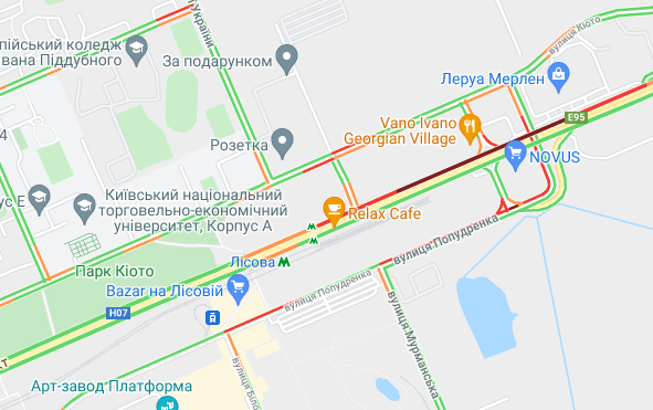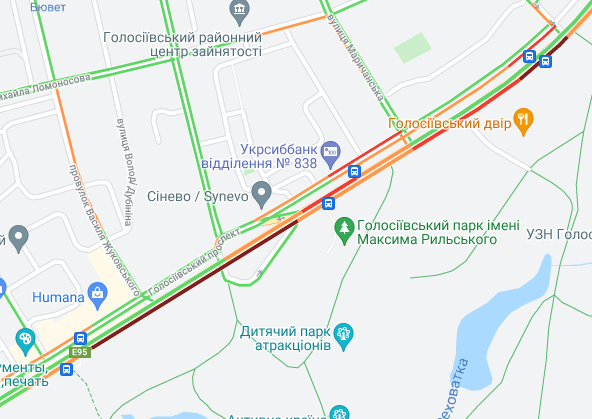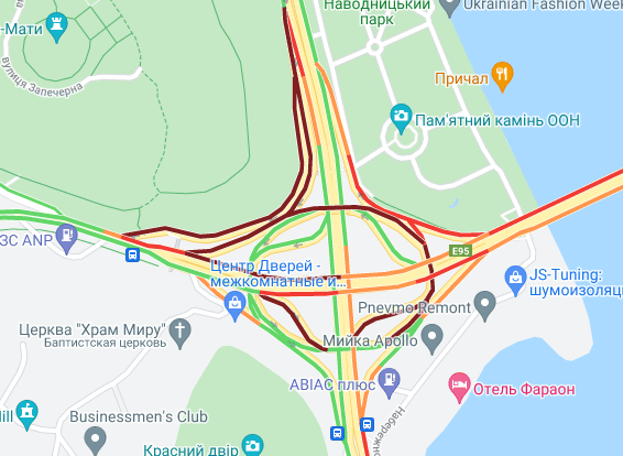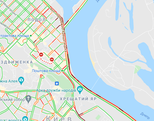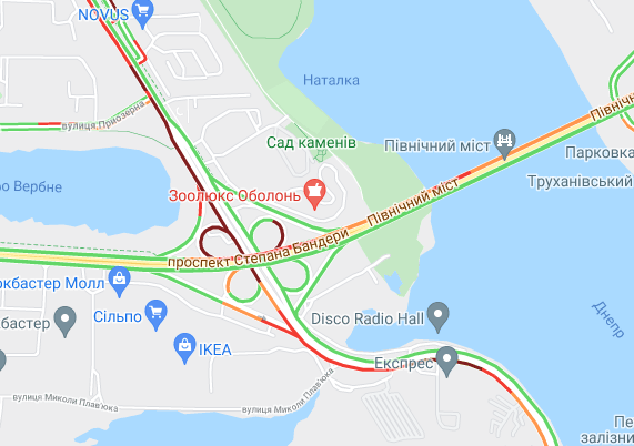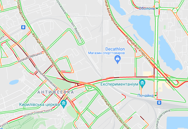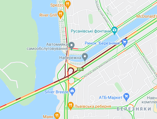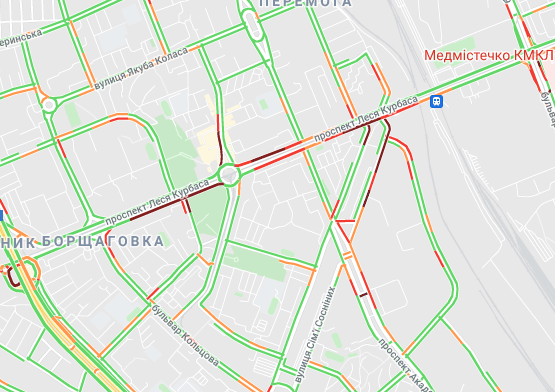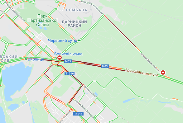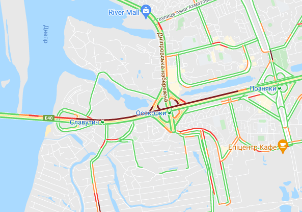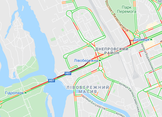 Важко проїхати по проспекту Соборності (біля ринку Березняки і на під'їзді до мосту Патона), а також біля станцій метро "Лівобережна" і "Лісова". Стоять авто по проспекту Миколи Бажана, між станціями метро "Осокорки" і "Славутич". Великі пробки спостерігаються на Бориспільській трасі, вул. Світла і вул. Бориспільська.