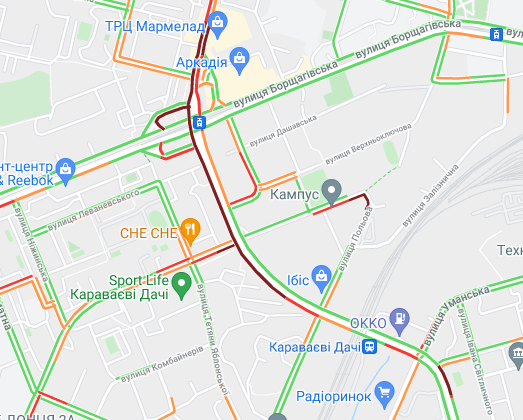 Станом на ранок середы, 21 липня, ускладнено транспортний рух в деяких районах Києва.