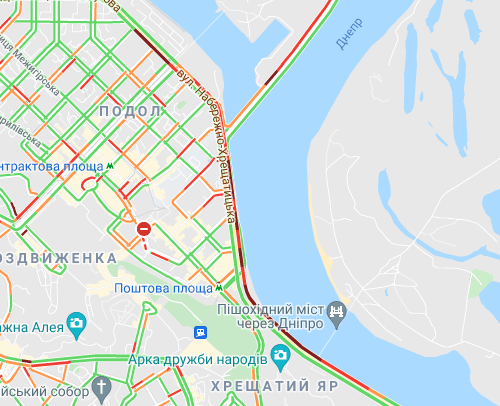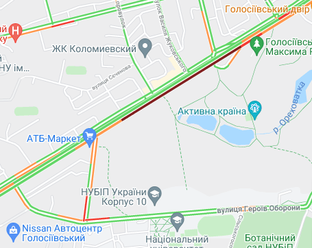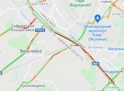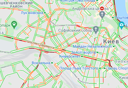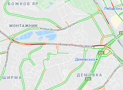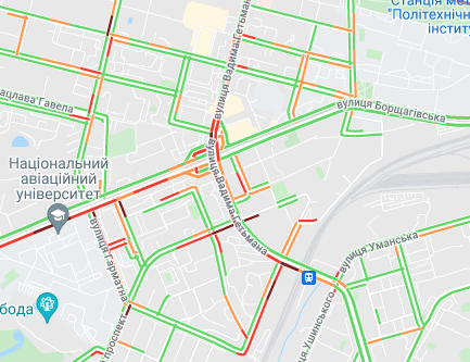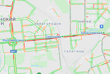 Затори утворилися на Кільцевій дорозі. Варто вулиця Вадима Гетьмана (від вул. ТРЦ Мармелад до вул. Польова). Авто важко поїхати станції метро "Святошин", "Берестейська" і "Житомирська". Утворилися затори на вул. Семена Скляренка, вул. Куренівська, вул. Кирилівська, вул. Богатирська. Водії стоять у заторі на проспекті Валерія Лобановського і Голосіївському проспекті.
