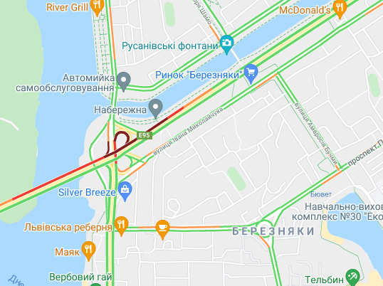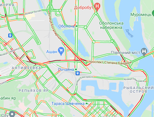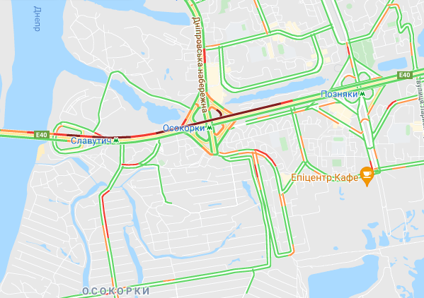Важко проїхати по проспекту Соборності (ближче до мосту Патона). Стоять авто по проспекту Миколи Бажана, між станціями метро "Осокорки" і "Славутич".