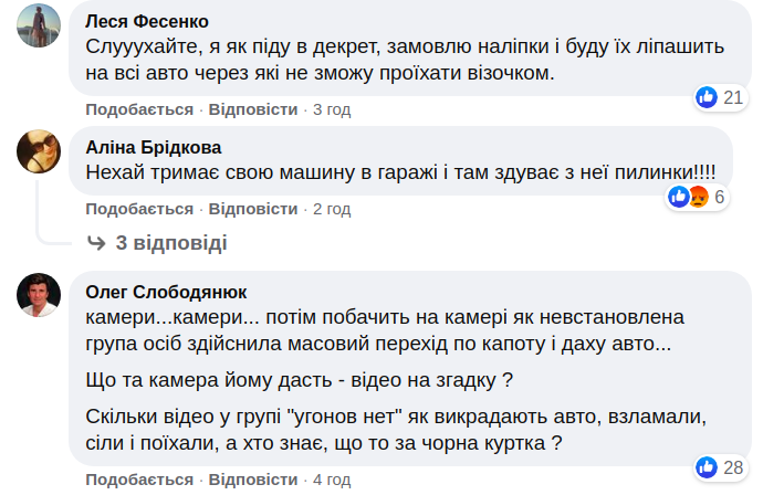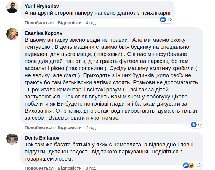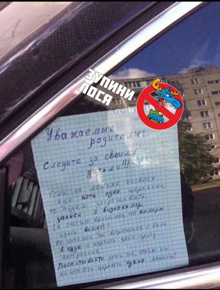 "Шановні батьки, слідкуйте за своїми дітьми!! Якщо на машині з'явиться ще хоч одна подряпина, то будемо запитувати записи з відеокамер (на щастя, з'ясувалося, що камери тут висять). Не хотілося б зустрічатися з вами в суді і псувати один одному настрій. Виховуйте дітей так, щоб їм не хотілося дряпати чужі машини ", - йдеться в повідомленні власника авто.