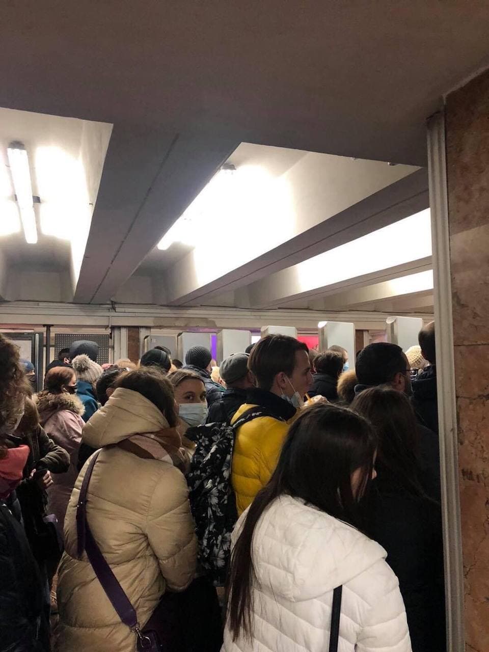 "Метро Почайна зараз, вся станція як банка шпротів. Але карантин тільки завтра, сьогодні ще можна дихати сусідові у вухо", - прокоментував фото автор публікації.