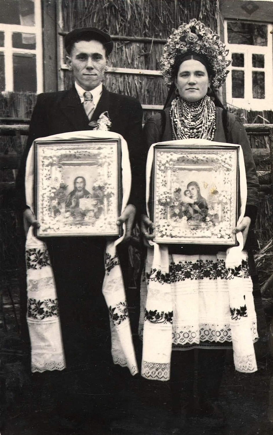 "Молодята з Троєщини, 1952 рік. Наречений Володимир Сидоренко. Збірка І.М.Гончара - альбом "Україна та Українці", т. 5 - "Київщина Лівобережна" КН-12733/44", - зазначається у підписі до фото.