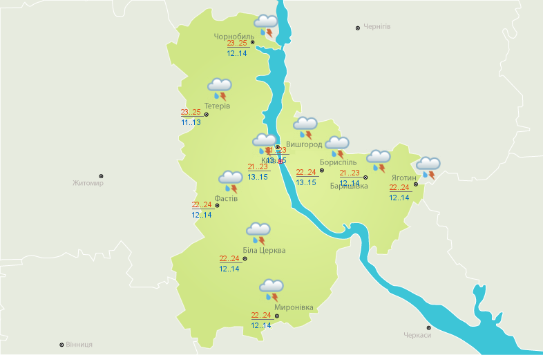 Кагарлик: температура вночі - від 14 до 16, вдень - від 20 до 21. У другій половині дня очікується дощ.