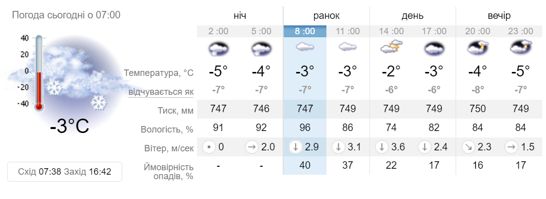 Вночі випав сніг. Вдень не очікується температура нижче -3°C. За даними метеостанції, погоду не затьмарять і опади: ні снігу, ні дощу протягом дня.