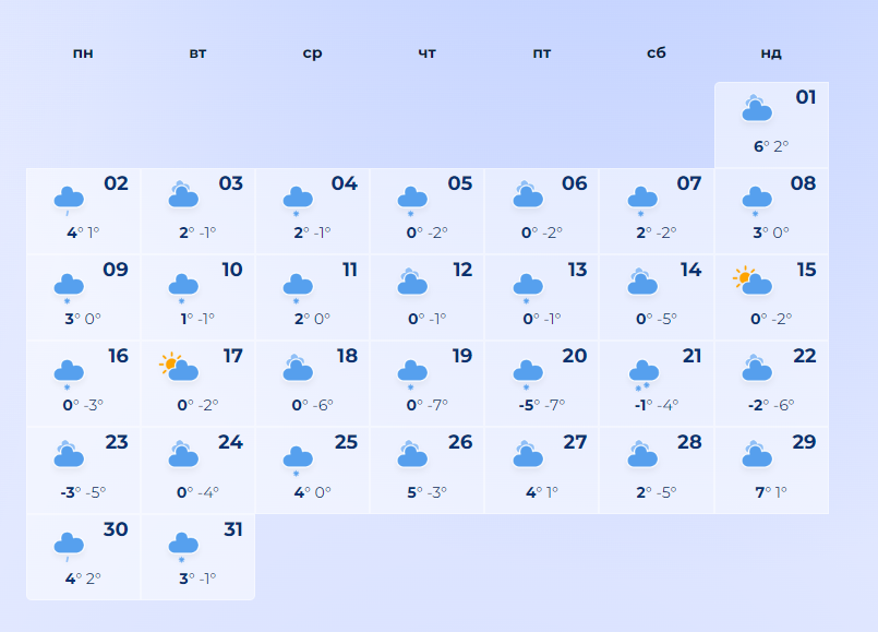 Перший місяць зими 2024-2025 буде теплішим за грудень попереднього року. В цілому сезон почнеться не зовсім типово. Середній температурний показник грудня прогнозується на рівні 0°C. Максимум температури у грудні прогнозується 29 грудня, він складатиме +7°C. Великої кількості опадів у грудні можна не чекати - їх очікується в середньому не більше 4 днів.