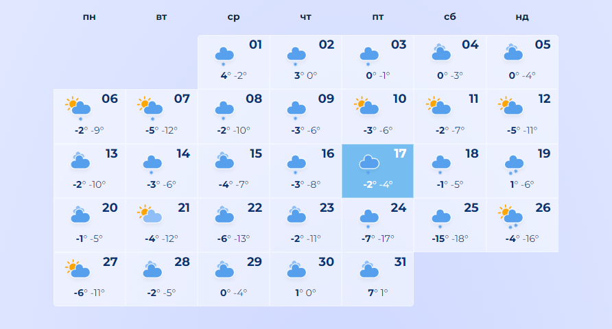 Середина зими традиційно принесе похолодання. Середня температура у січні коливатиметься на рівні -5°C. Найтепліше буде 31 січня з температурою +7°C, найхолоднішим днем буде 25 січня, коли вдарять морози до -18°C. Опадів в січні також буде небагато, в основному їх варто чекати у період з 8 по 24 січня.