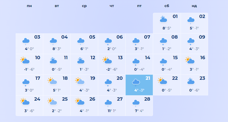 Лютий буде відносно прохолодним. Середня температура місяця складе близько 0°C - майбутній лютий обіцяє стати холоднішим за лютий-2024 на 4°C. Кількість опадів залишиться незмінною - очікується до 3 "мокрих" днів в період 21-го лютого.
