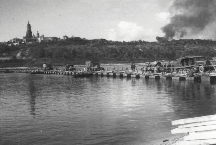 "Понтонна переправа через Дніпро, 1941 рік. Поруч вивантажено каміння для будівництва майбутнього мосту Шарнхорста. Ці камені досі можна побачити на березі гідропарку", - так підписане фото.