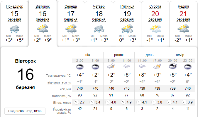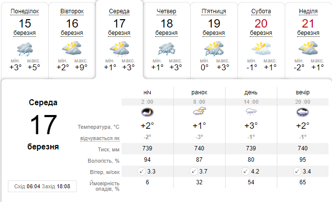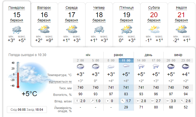 Так, в понеділок, 15 березня, в Києві очікується похмура погода з температурою від +3 до +5 впродовж доби. У другій половині дня в столиці прогнозується дощ.