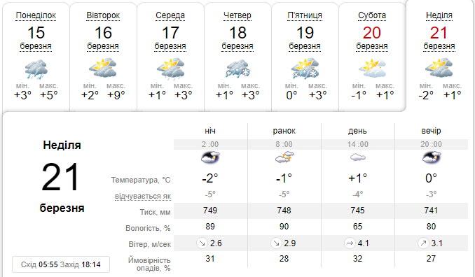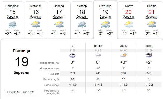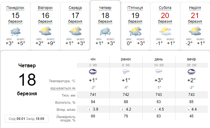 У четвер, 18 березня, в столиці утримається прохолодна погода з температурою на рівні +3 градусів вдень і +1 вночі. Дощ, який розпочнеться вночі, перейде у другій половині дня у сніг.