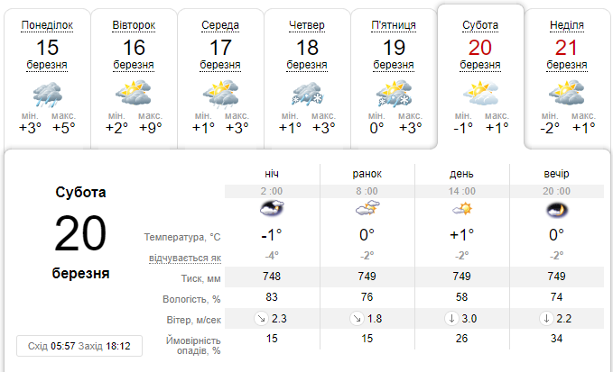 У суботу, 20 березня, в столиці очікується ясний день, однак стовпчики термометрів опустяться до мінусових значень: вдень - +1, вночі - 1 градус морозу. Опадів не очікується.