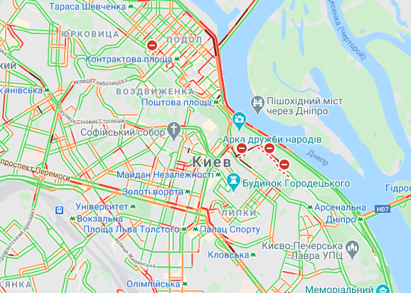 Так, рух паралізовано в центральній частині міста, також спостерігаються затори на всіх великих мостах через Дніпро.