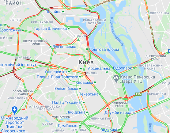 Зокрема, в центрі міста пробки виникли на вулиці Набережно-Хрещатицькій, Набережному шосе, проспекті Перемоги, бульварах Лесі України та Тараса Шевченка, вулицях Олени Теліги та Новокостянтинівській.