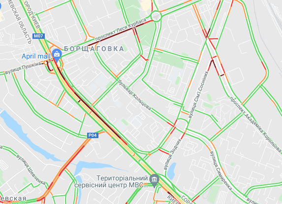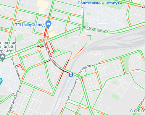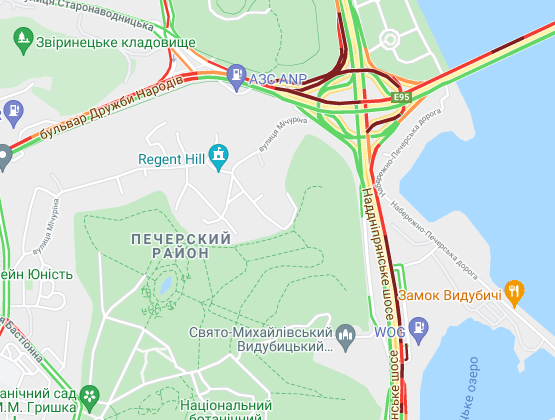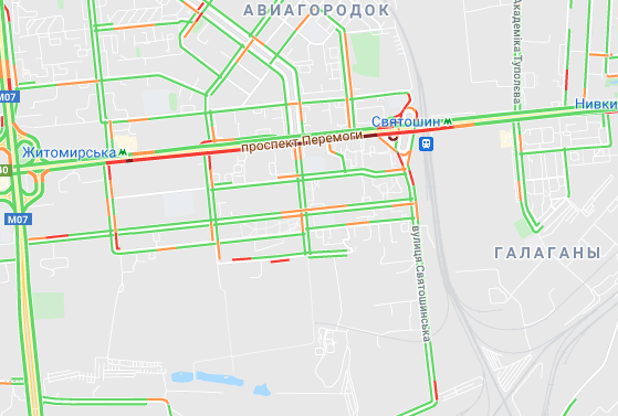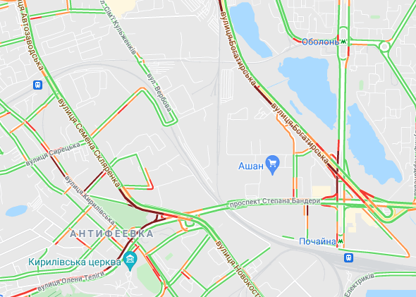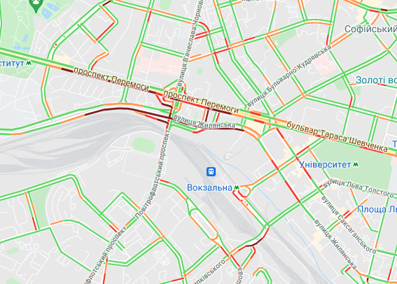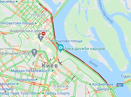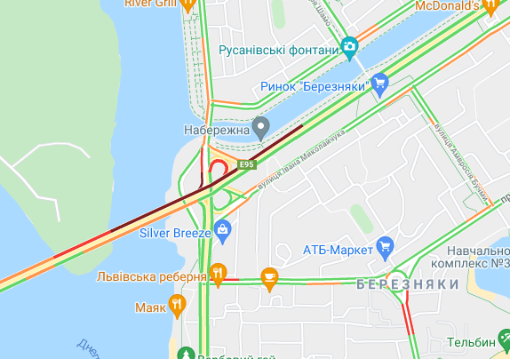 У великій "тягучці" стоять водії на Набережно-Хрещатицькій. Ускладнено рух транспорту на вул. Жилянська, вул. Борщагівська і на проспекті Перемоги. Затори утворилися бульварі на Дружби народів.