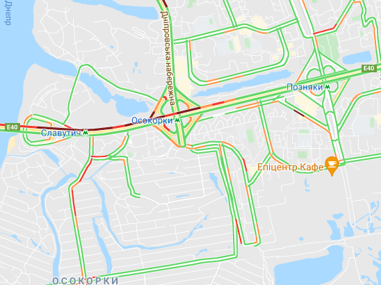 Ускладнено проїзд авто по проспекту Соборності (ближче до мосту Патона), на Бориспільській трасі і по проспекту Миколи Бажана, біля станцій метро "Осокорки", "Славутич".