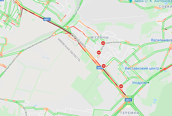 Від станції метро "Теремки" по Кільцевій дорозі важко проїхати. Стоять авто на вулиці Вадима Гетьмана (від вул. Борщагівська до вул. Польова) і на проспекті Леся Курбаса. Утворилися затори на вул. Богатирська, вул. Семена Скляренка, вул. Сирецька, вул. Кирилівська.