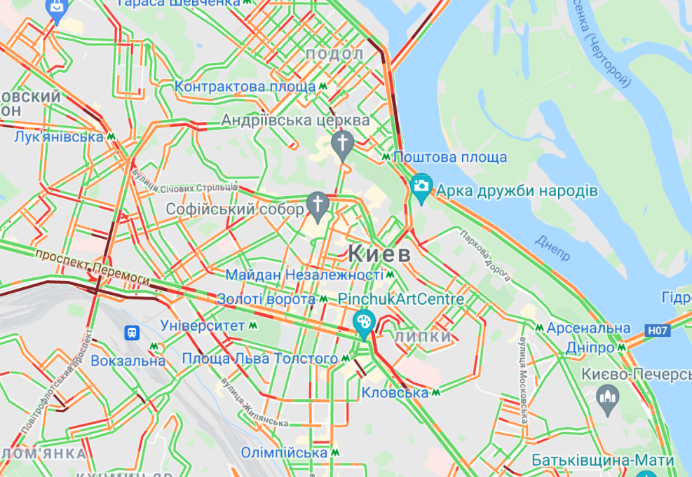Станом на ранок п'ятниці, 24 грудня, на дорогах Києва утворилися невеликі пробки біля мостів, на Оболоні та в центрі міста.