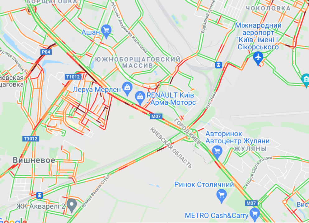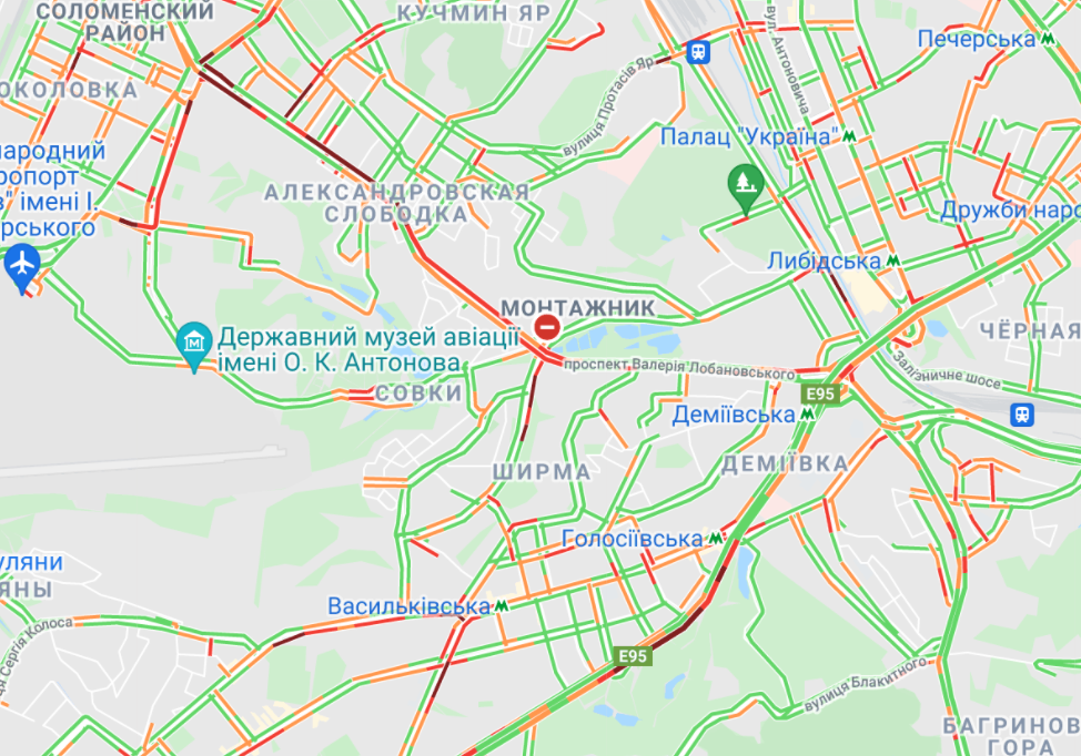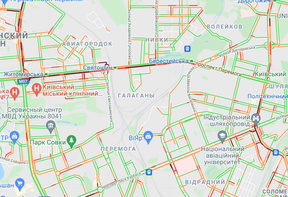 Затори утворилися на Софіївській Борщагівці. Важко проїхати вул. Вадима Гетьмана, проспекту Лобановського (Севастопольська площа). Утруднений рух на Оболоні (вул. Вишгородська, вул. Богатирська, вул. Семена Скляренка, станції метро "Дорогожичі"). Водії стоять у пробці від станції метро "Житомирська" до "Берестейської".