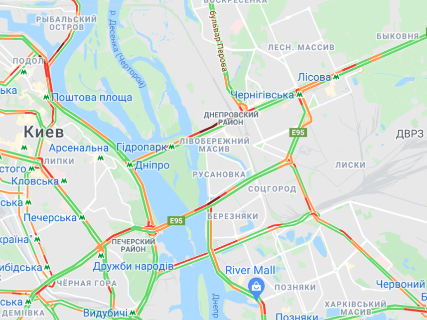 Утруднений проїзд авто біля станцій метро "Дарниця" та "Лівобережна". Важко проїхати проспектом Соборності (ринок "Березняки") та проспектом Миколи Бажана.