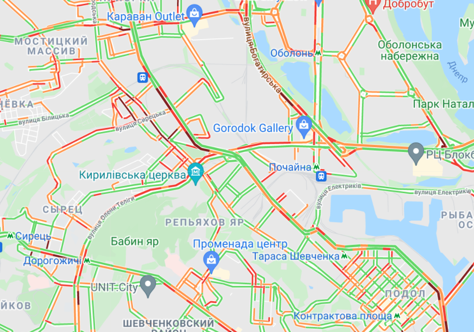Авто стоять у тягучках на Набережно-Хрещатикою, утруднений рух транспорту на проспекті Перемоги та вул. Жилянська.