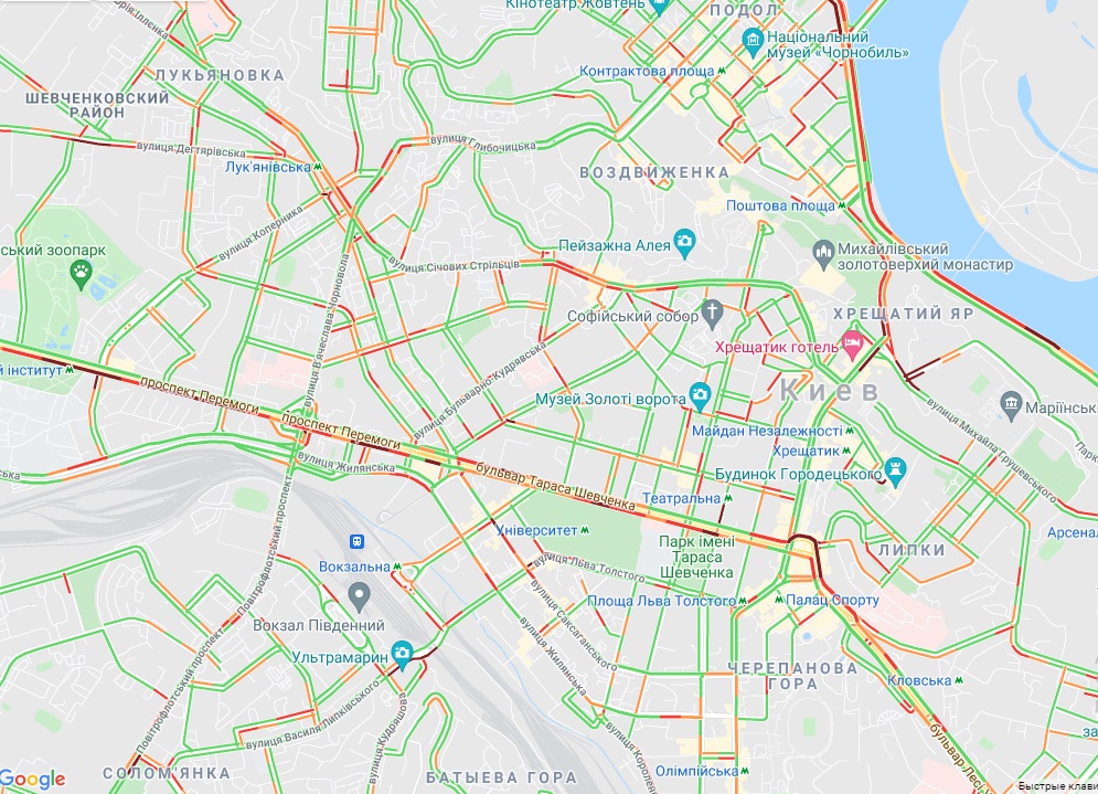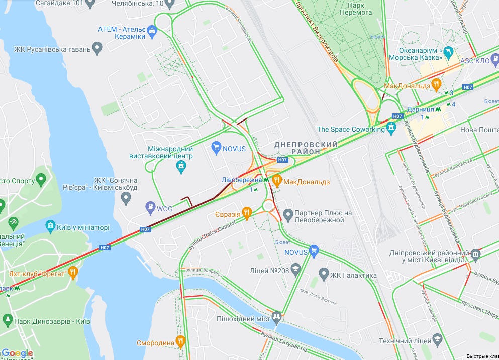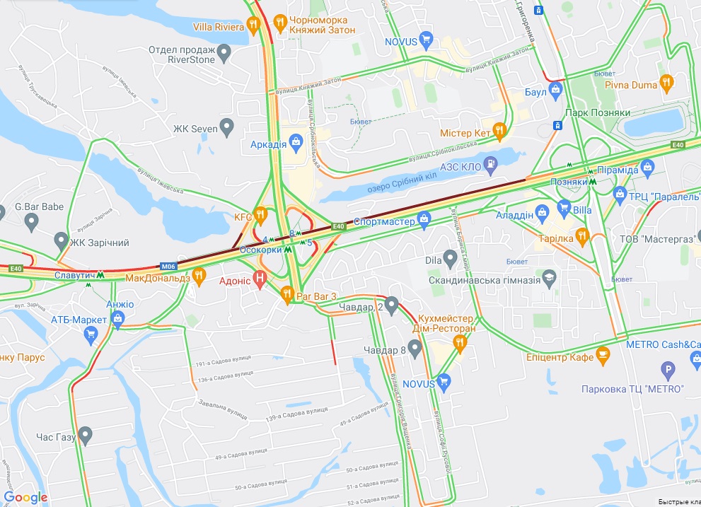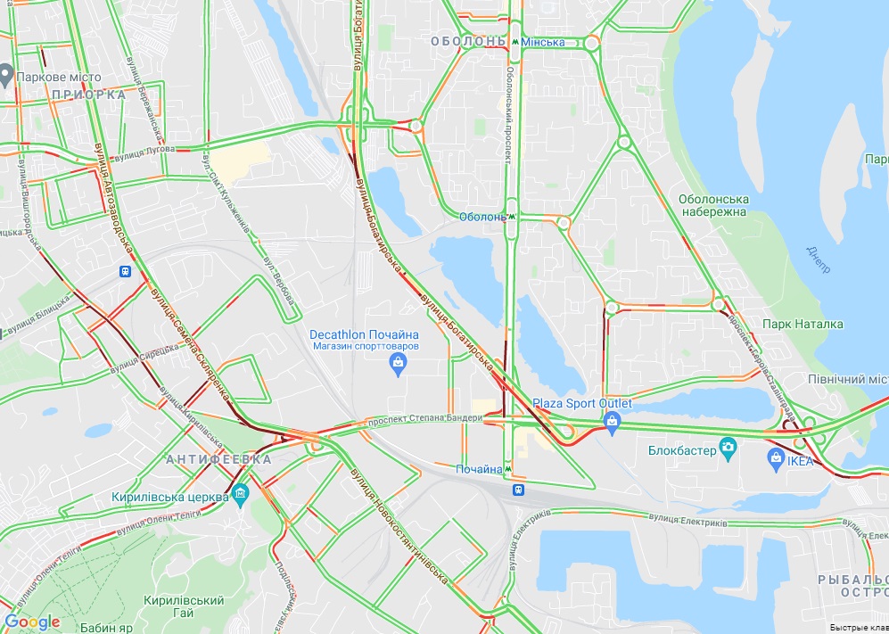 Утворилися затори на проспекті Степана Бандери (біля Куренівського парку), вул. Богатирська. Ускладнено рух авто на недбало-Рибальському, Наддніпрянському шосе, бульварі Дружби народів.
