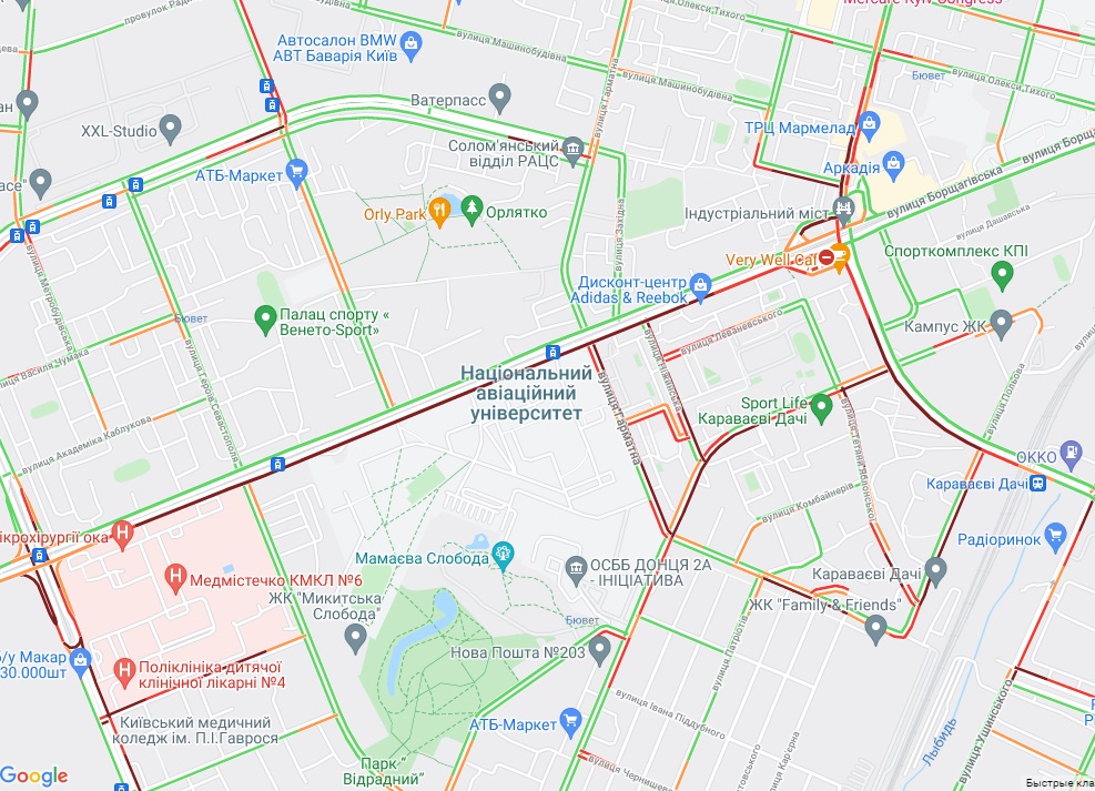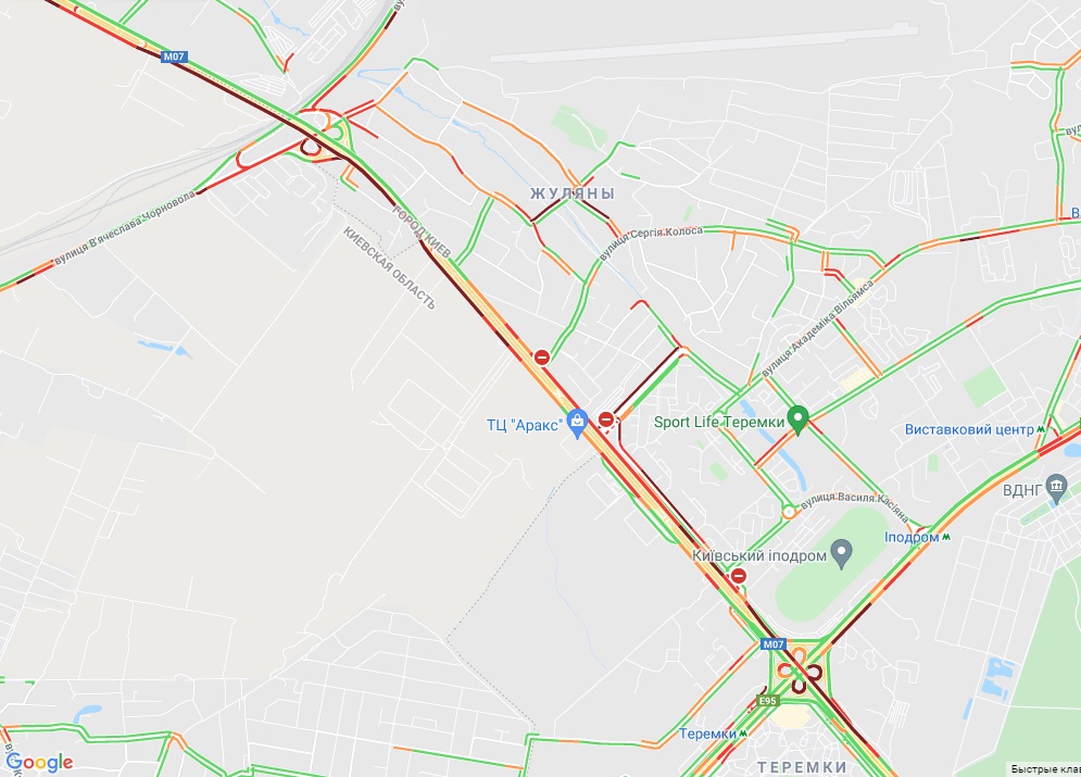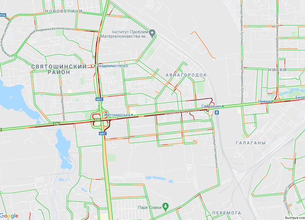 Пробки утворилися по Кільцевій дорозі (від ст. Метро "Теремки"). "Стоять" вулиця Вадима Гетьмана (до ст. Метро "Шулявська") і на проспекті Лобановського. Автомобілям важко проїхати біля станцій метро "Житомирська", "Святошин".