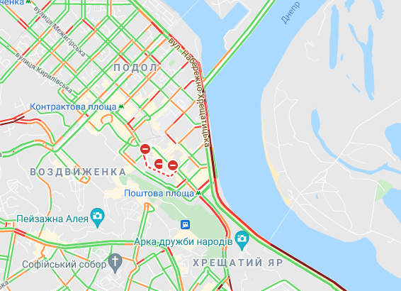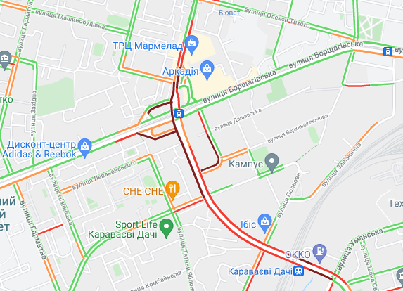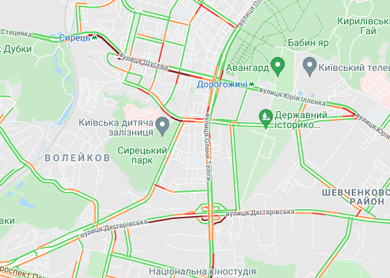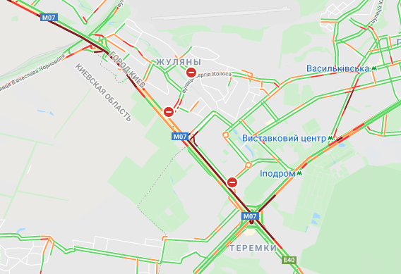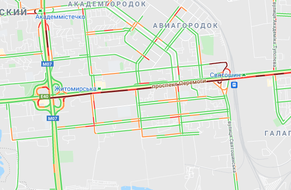 Затори утворилися на Кільцевій дорозі. "Варто" вулиця Вадима Гетьмана (від вул. Уманська до ТРЦ Мармелад). Авто важко поїхати станції метро "Святошин" і "Житомирська", а також "Сирець". Утворилися затори на вул. Семена Скляренка, вул. Куренівська, вул. Кирилівська, вул. Богатирська. Ускладнено рух на бульварі Дружби народів.