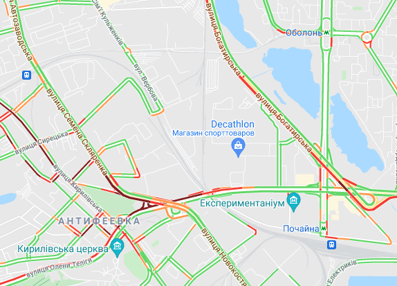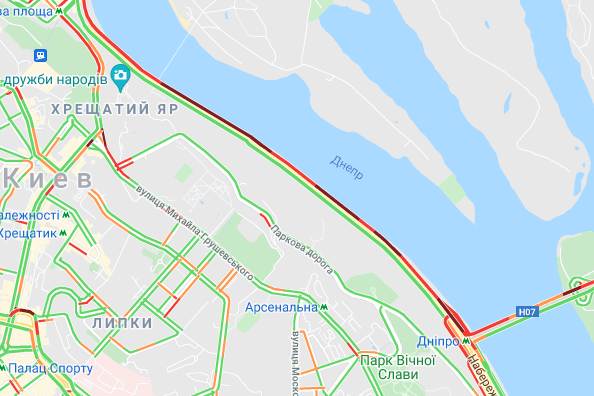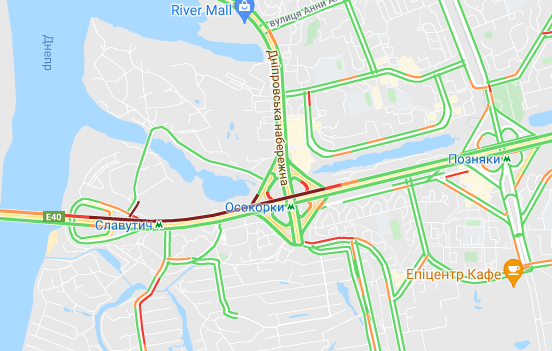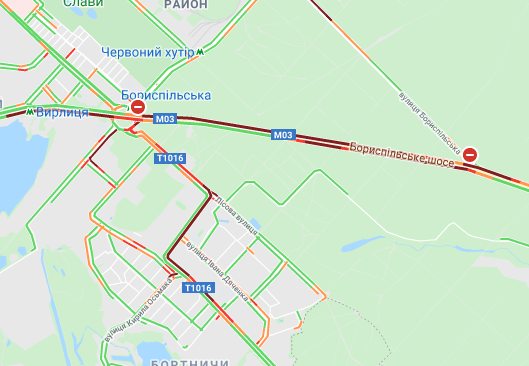 Важко проїхати по проспекту Соборності (ближче до мосту Патона). "Стоять" авто по проспекту Миколи Бажана, між станціями метро "Осокорки" і "Славутич". Велика пробка утворилася на Бориспільській трасі (від вул. Бориспільська до ст. Метро "Вирлиця", в обидві сторони).