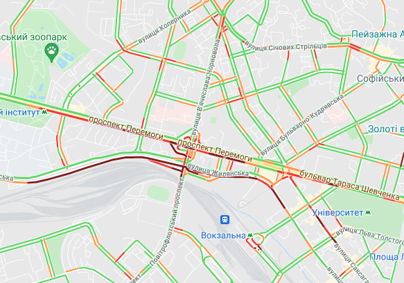 Авто стоять в невеликих пробках на проспекті Перемоги (від вул. В'ячеслава Чорновола до вул. Бульварно-Кудрявська). Важко рухатися вулицею. Жилянська. Ускладнено рух по Набережному шосе і Набережно-Хрещатицькій.