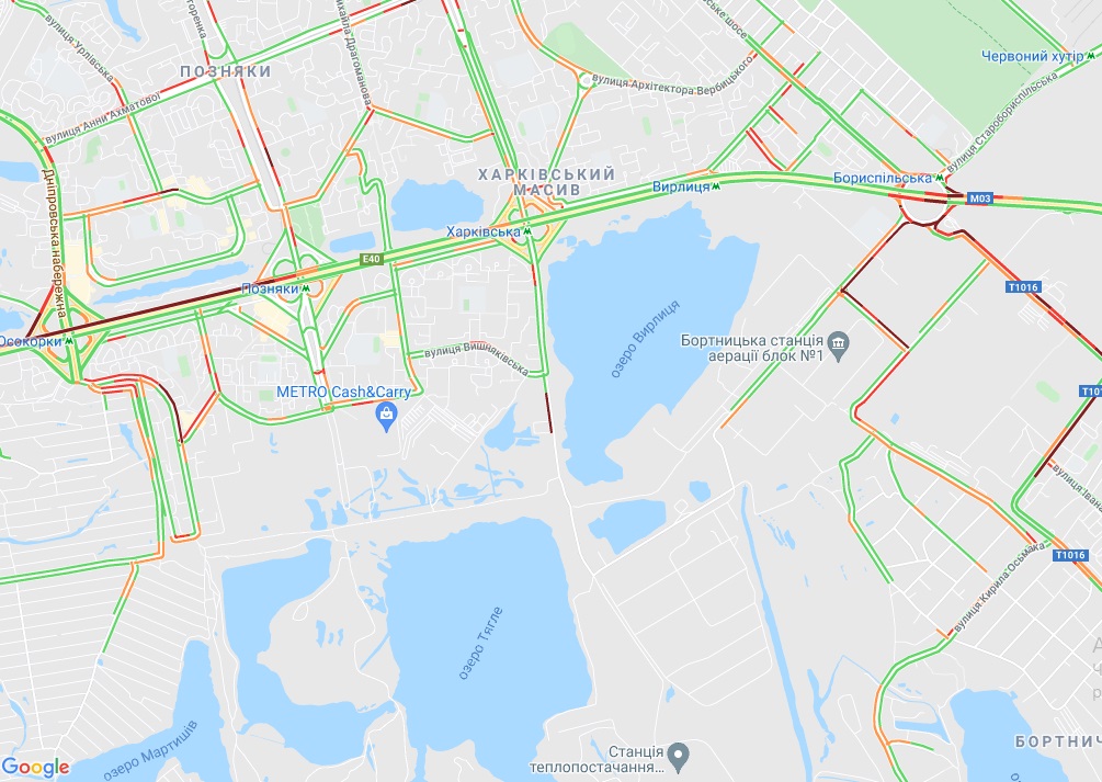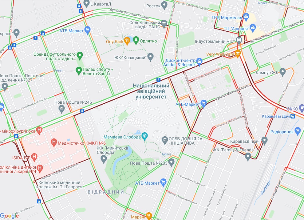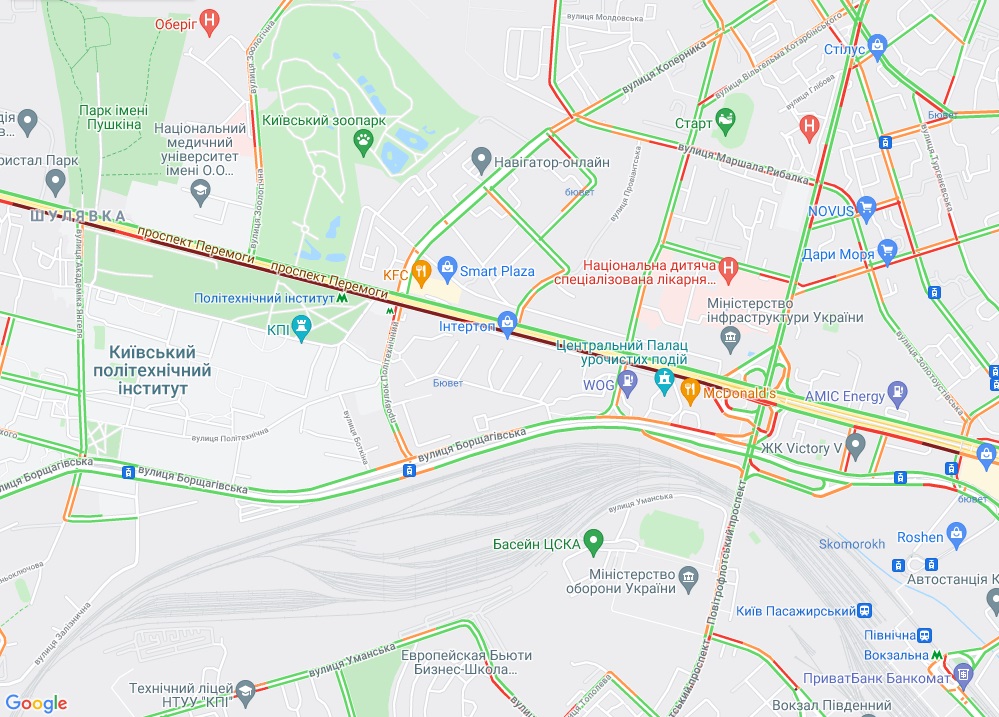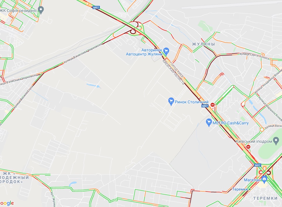 Від станції метро "Теремки" по Кільцевій дорозі стоїть рух, як і по вулиці В'ячеслава Чорновола неподалік. Пробки утворилися на вул. Соборна (Софіївська Борщагівка), вул. Вацлава Гавела, вул. Леся Курбаса (Відрадний). Велика "тягучка" на вул. Борщагівській і в районі Індустріального моста. Затори спостерігаються біля метро "Берестейська" і "Житомирська".