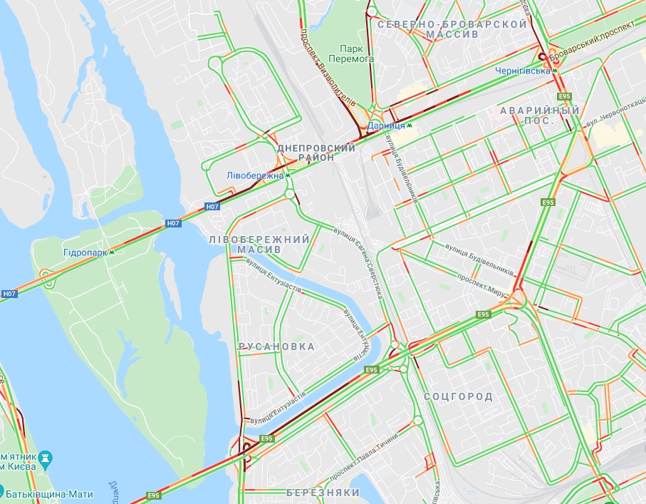 Ускладнено рух авто на проспектах Броварському і Визволителів, а також біля станцій метро "Дарниця" та "Лівобережна". Важко проїхати по Дарницькому шосе в районі Русанівки, вул. Світла, біля станцій метро "Позняки", "Осокорки" та "Бориспільська".