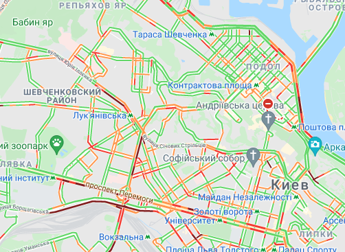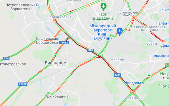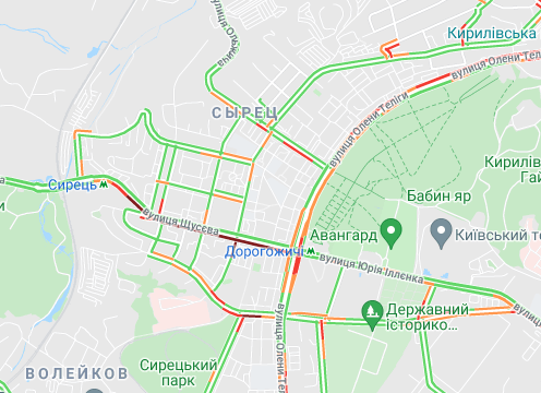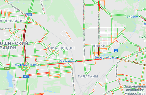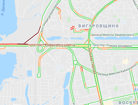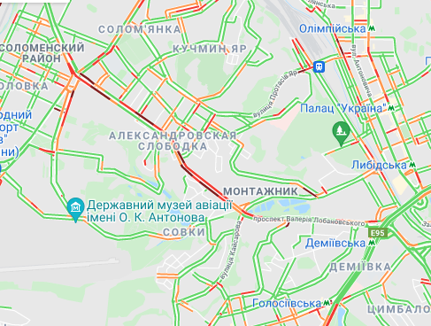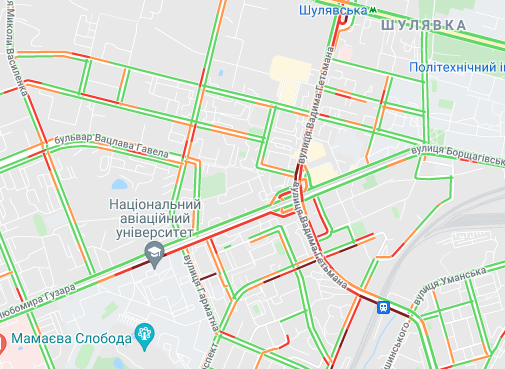 Авто стоять в невеликих пробках на проспекті Перемоги. Важко рухатися вулицею. Жилянська і Борщагівська. Ускладнено рух автомобілів на Парковій дорозі і на Набережно-Хрещатицькій, а також біля станції метро "Видубичі".