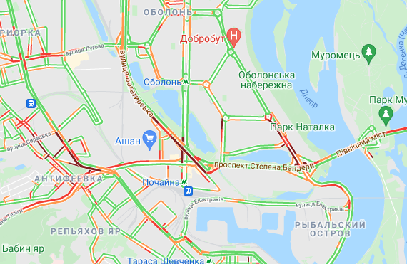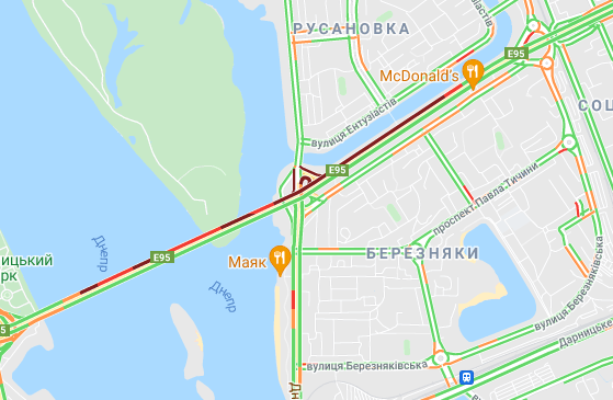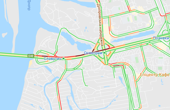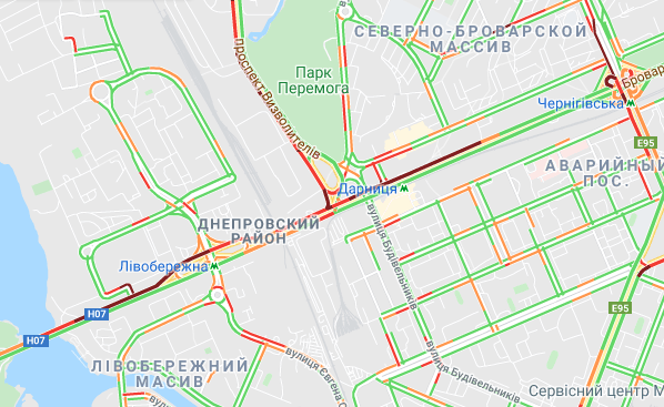 Невеликі пробки утворилася на проспекті Романа Шухевича і вул. Оноре де Бальзака. "Тягучки" спостерігають біля станцій метро "Лівобережна", "Дарниця", "Чернігівська". Важко рухатися вулицею Братиславська (біля Епіцентру), проспекту Соборності і по мосту Патона. Стоять авто в пробці по проспекту Миколи Бажана, між станціями метро "Осокорки" і "Славутич", а також біля "Бориспільської".