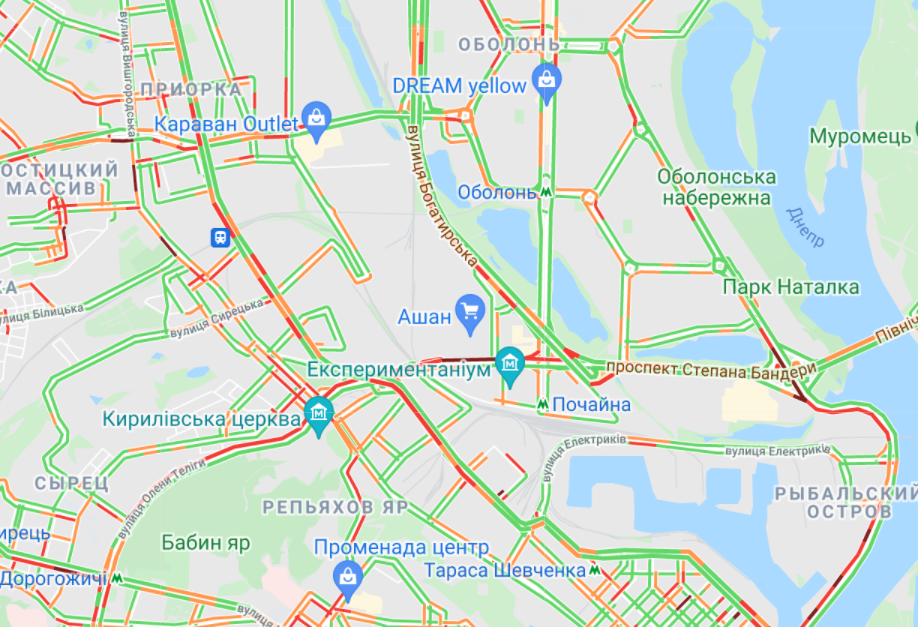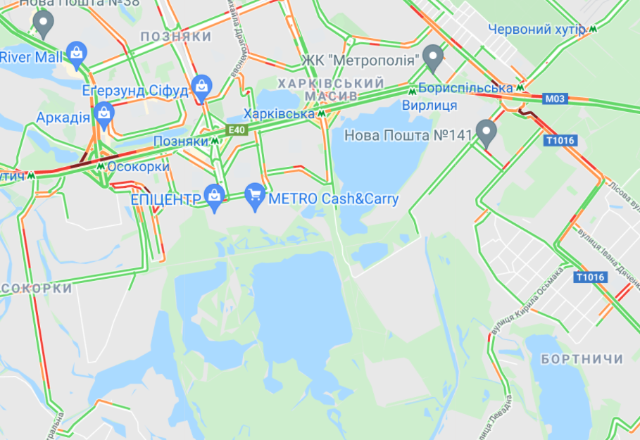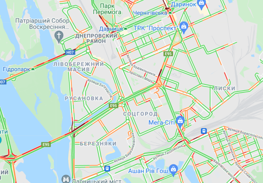 Утруднений проїзд авто біля станцій метро "Чернігівська", "Дарниця", а також поблизу Русанівського мосту. Важко проїхати проспектом Соборності (ринок "Березняки") та проспектом Миколи Бажана, біля станцій метро "Осокорки", "Позняки", "Славутич" та "Бориспільська".
