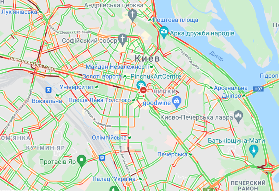 Авто стоять на Набережно-Хрещатицькій, утруднений рух транспорту на проспекті Перемоги, вул. Жилянська та вул. В'ячеслав Чорновола. Незначні затори спостерігаються на бульварі Дружби Народів.