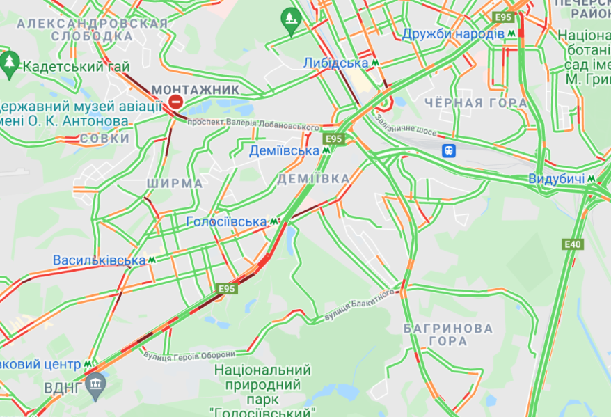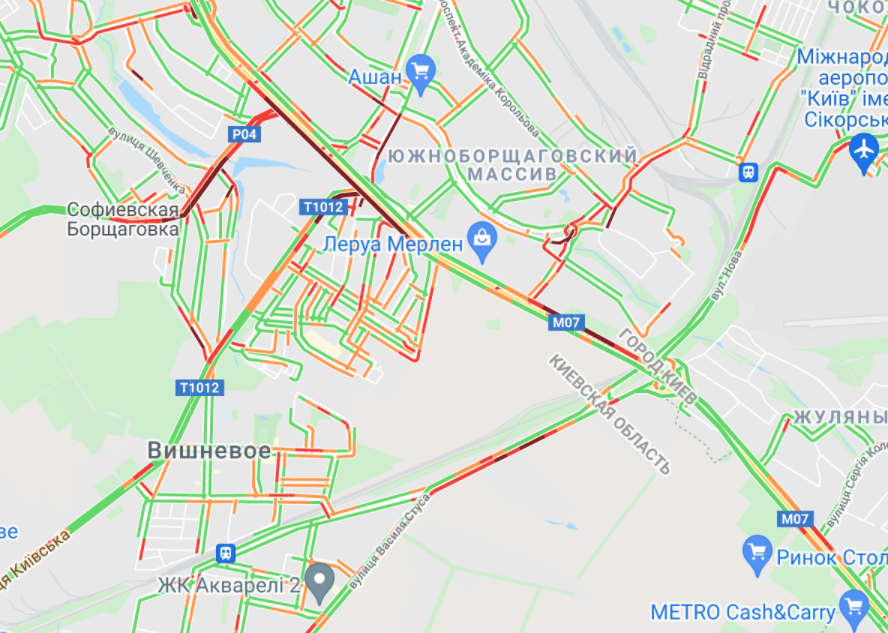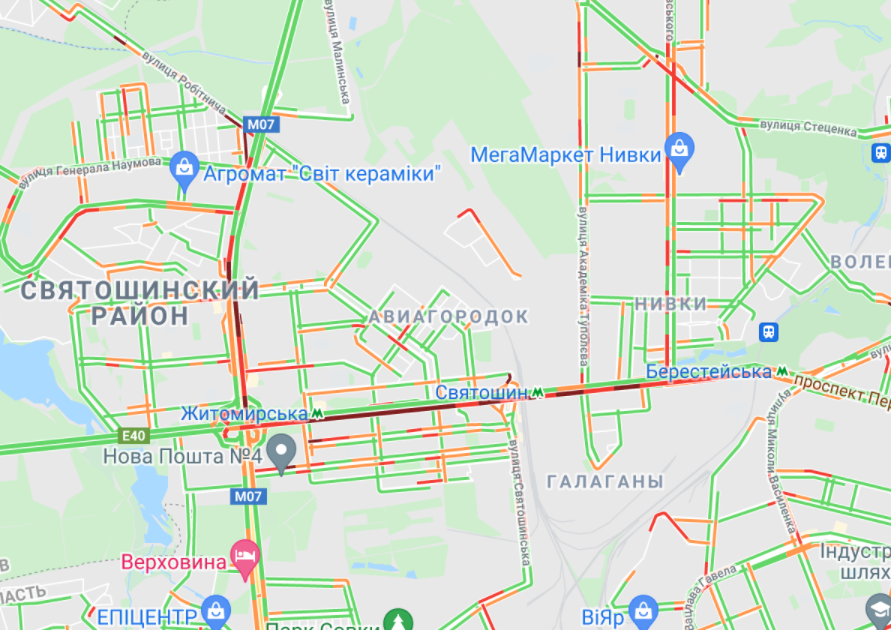 Традиційно затори утворилися на Кільцевій дорозі. Важко проїхати вул. Вадима Гетьмана, проспекту Леся Курбаса, проспекту Лобановського. Вільний рух на Оболоні: пробки спостерігаються лише на Набережно-Рибальській та проспекті Героїв Сталінграда. Невеликі затори утворилися на Голосіївському проспекті. Водії стоять у довгій пробці від станції метро "Житомирська" до "Берестейської".