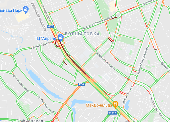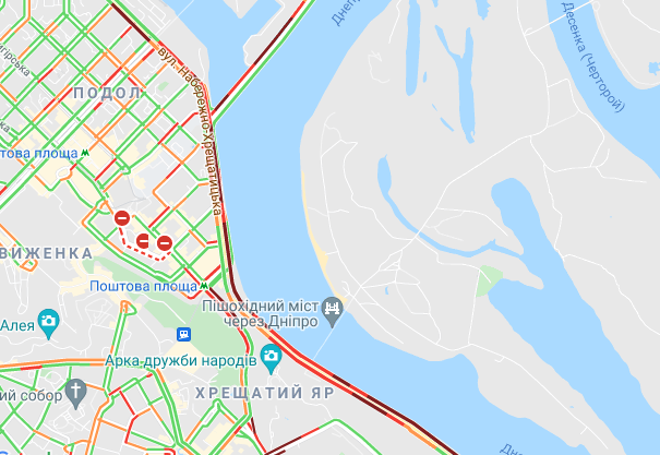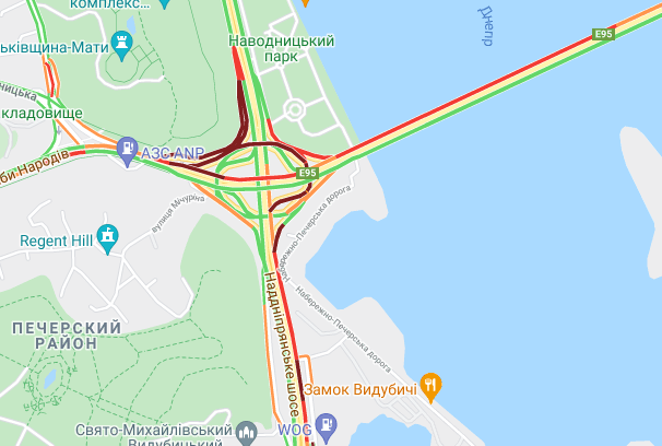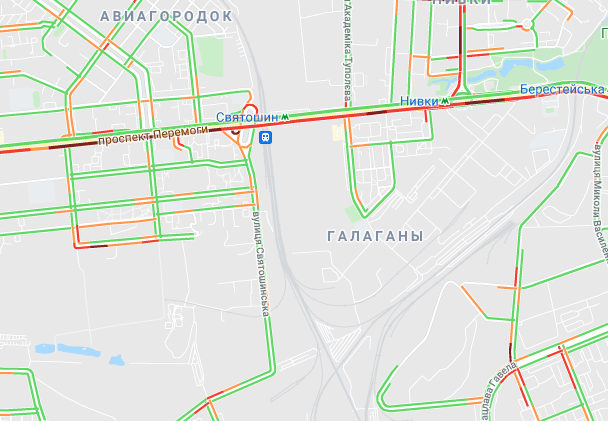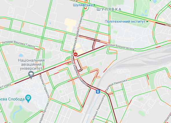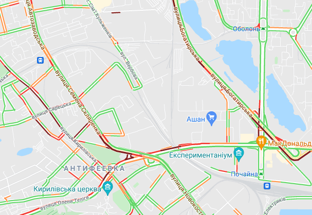 Пробки утворилися по Кільцевій дорозі. Стоїть вулиця Вадима Гетьмана (від вул. Уманська до ТРЦ Мармелад). Утворилися затори на вул. Семена Скляренка, вул. Куренівська, вул. Олени Теліги, вул. Кирилівська, вул. Богатирська. Ускладнено рух по Наберережено-Хрещатицькій. Важко проїхати біля станцій метро "Берестейська", "Святошин" і "Ьерестейская".