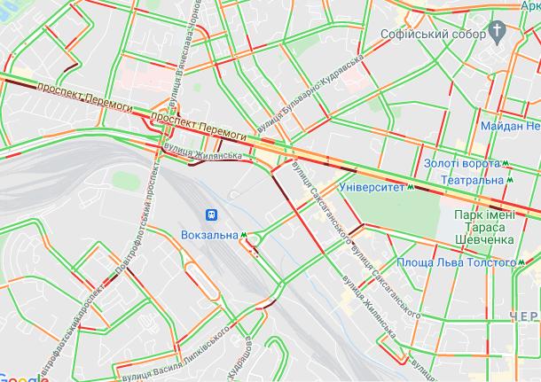 Авто стоять в невеликих пробках на проспекті Перемоги. Важко рухатися вулицею. Жилянська. Затори утворили на бульварі Дружби народів і Набережному шосе.