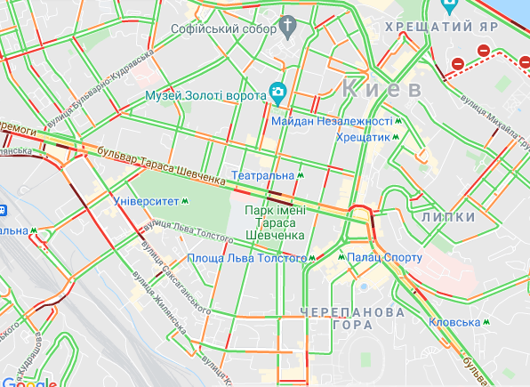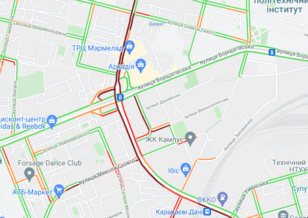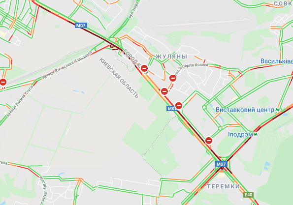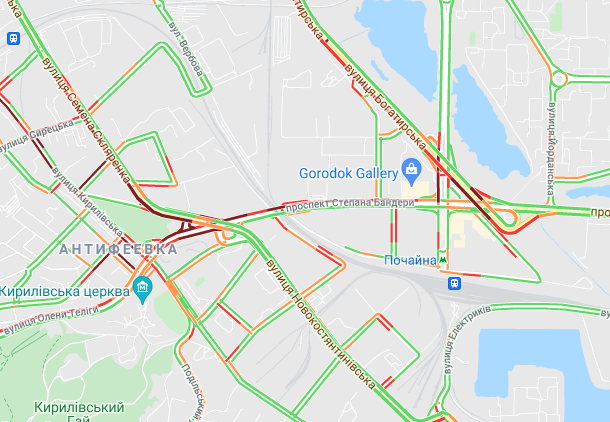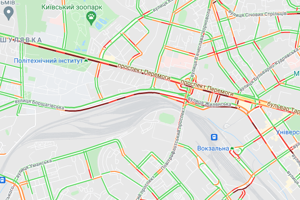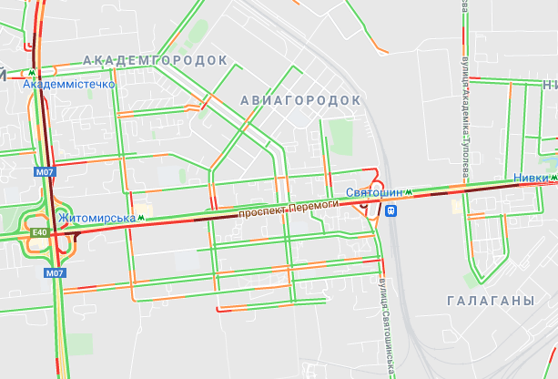 Пробки утворилися по Кільцевій дорозі. Варто вулиця Вадима Гетьмана (від вул. Уманська до вул. Алекси Тихого). Утворилися затори на вул. Семена Скляренка, вул. Олени Теліги, проспекті Степана Бандери, вул. Куренівська, вул. Кирилівська, вул. Богатирська. Ускладнено рух по Набережному шосе. Важко проїхати біля станцій метро "Святошин", "Житомирська" та "Академмістечко", а також по Набережно-Рибальській.