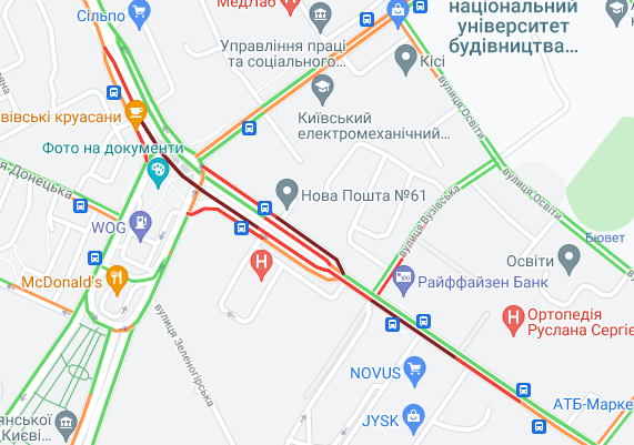 Авто стоять в невеликих пробках на проспекті Перемоги. Важко рухатися вулицею. Жилянська. Ускладнено рух автомобілів на Парковій дорозі і по Набережно-Хрещатицькій. Пробка утворилася на бульварі Дружби народів.