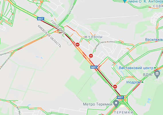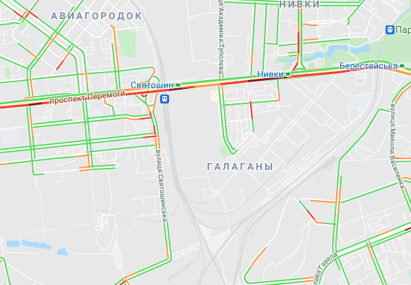 Пробки утворилися по Кільцевій дорозі. Важко проїхати по вулиці Вадима Гетьмана (від вул. Борщагівська до вул. Польова), по проспекту Любомира Гузара. Утворилися затори на проспекті Степана Бандери, вул. Семена Скляренка, вул. Куренівська та Богатирська (біля Епицентра), а також біля станцій метро "Нивки" і "Святошин". Водії стоять в заторі біля Севастопольської площі.