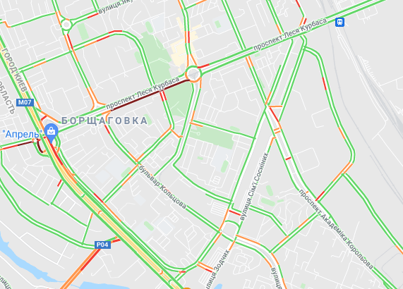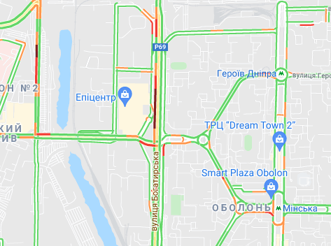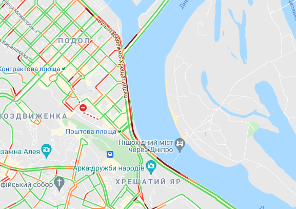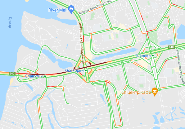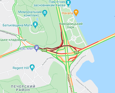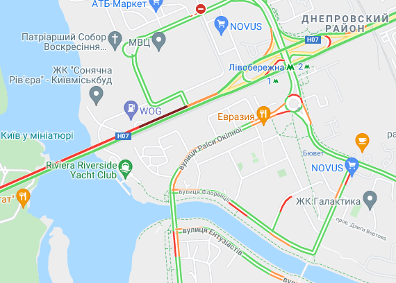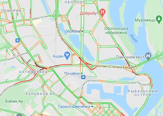 Невеликі пробки утворилася між станцією метро "Лівобережна" і Русанівським мостом. Водії стоять в заторі на проспекті Миколи Бажана, між станціями метро "Славутич" і "Осокорки".